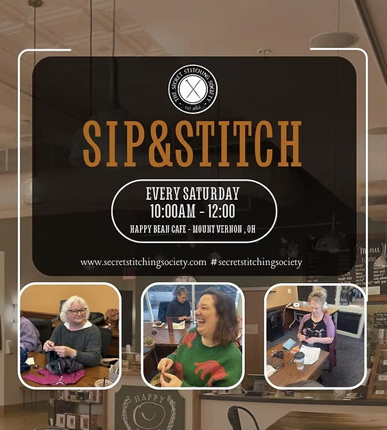 Our Sip&Stitch takes place each Saturday 10-12 in the conference room at Happy Bean Cafe on Main Street. A comfortable space and a welcoming group of women.